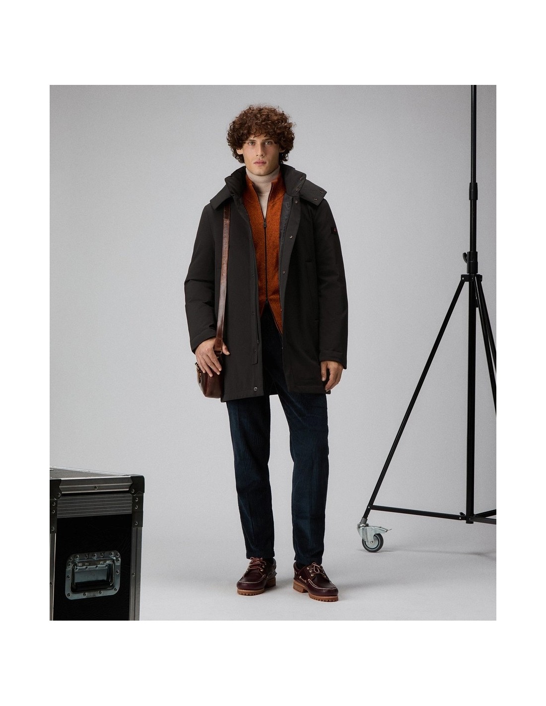 PeutereyTrench liscio e tecnico in tessuto stretch di poliestere riciclato con struttura twill, dall’aspetto pulito ed opaco con proprietà antivento e idroreppellenti. Il design essenziale è completato da collo in piedi, fodera interna check, cappuccio staccabile, zip nascosta a doppio cursore e due ampie tasche laterali. Le linee essenziali di questo capo reinterpretano lo stile classico e senza tempo di un cappotto tecnico da uomo dalle elevate performance. Adatto a proteggersi dal freddo della stagione invernale grazie all’imbottitura sintetica, è un capo must-have che valorizza qualsiasi tipo di outfit.